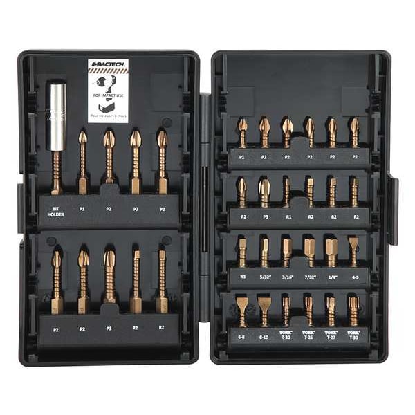 Driver Bit Set, No. of Pieces 34, Hex Shank Size 1/4 in, Fastening Tool Material Steel, Impact Rated Impact Rated, Impact, Includes 1/4 in, 3 x 1 in, 3 x 2 in, 3/16 in, 30 x 1 in, 6-8, 7/32 in, 8-10 x 1 in, Hex 5/32 in, Mag Bit Holder, Phillips #1, Slotted 4-5, Square #1, (2) Square 2 x 2 in, TORX(R) 20, Bit Length 1 in, 2 in, 3 in