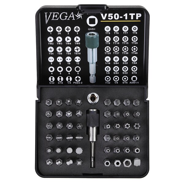The Vega Industries, Inc. V50-1P Screwdriver Bit Set is a great addition to your toolbox. It has an assortment of screwdriver bits that can be used for multiple purposes around the house and on the job site. The Vega Industries, Inc. 50Pc Driver Bit Set will make all those little jobs much easier with its variety of bits and attachments.