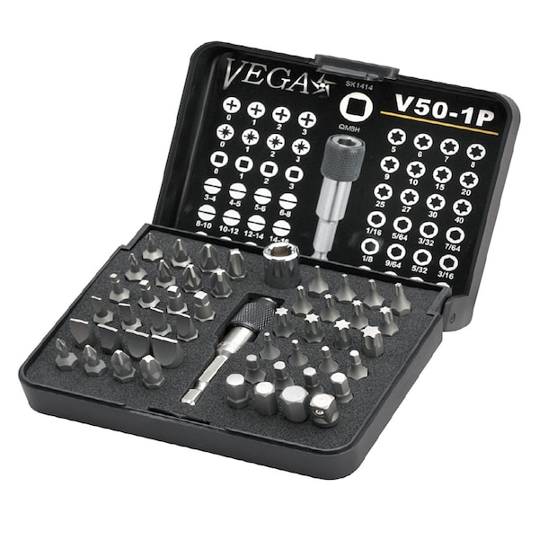VEGA V50-1P 50pc Driver Bit SetMade from S2 modified shock resistant steel for professional performance and durability.Proprietary precision CNC machined tips for excellent fit in fastener recess.Heavy duty drop resistant storage case.Contents: PHILLIPS: 0, 1, 2, 3PHILLIPS: 0, 1, 2, 3 ACRPOZIDRIV: 0, 1, 2, 3TORX: 5, 6, 7, 8, 9, 10, 15, 20, 25, 27, 30, 40SLOTTED: 3-4, 4-5, 5-6, 6-8, 8-10, 10-12, 12-14, 14-16HEX: 1/16, 5/64, 3/32, 7/64, 1/8, 9/64, 5/32, 3/16, 7/32, 1/4, 5/16SQUARE: 0, 1, 2, 3ADAPTER: 1/4in x 1/4inSOCKET: 1/4in x 1/4inQuick Release Bit Holder