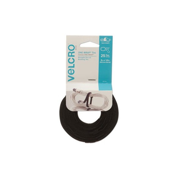VELCRO Brand ONE-WRAP Ties and Straps are ideal for organizing and harnessing data cables, electrical wires, and fiber optics. The simple one-piece design wraps onto itself for a secure hold. Reusable, low profile, and economical option for fastening wires and organizing cords. Pre-Cut Thin Ties. Hook and Loop Fastener Type: Tie; Suggested Use: Indoor Light-Duty; Colors: Black; Tape Pad Size: 0.25in x 8in.