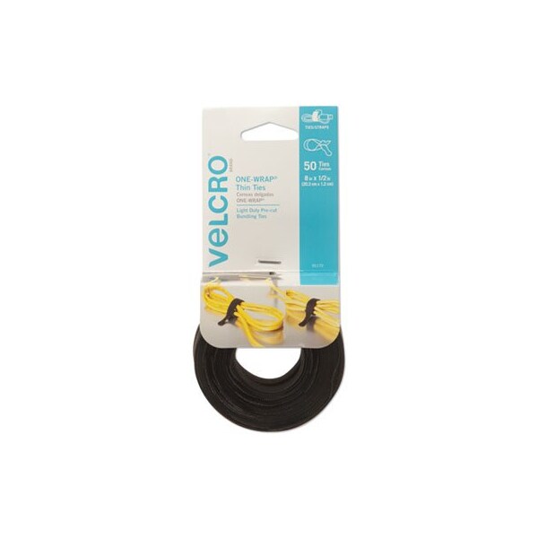 VELCRO Brand ONE-WRAP Ties and Straps are ideal for organizing and harnessing data cables, electrical wires, and fiber optics. The simple one-piece design wraps onto itself for a secure hold. Reusable, low profile, and economical option for fastening wires and organizing cords. Pre-Cut Thin Ties. Hook and Loop Fastener Type: Tie; Suggested Use: Indoor Light-Duty; Colors: Black; Tape Pad Size: 0.5in x 8in.