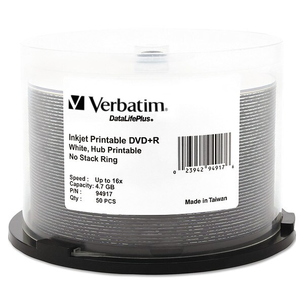 DVD-R Disc, Capacity 4.7 GB, Time 120 min, Speed 16x, Packaging Spindle, Surface Type Inkjet Printable, Color White, Includes Plastic Container, Package Quantity 50