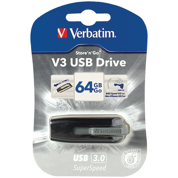 The Verbatim SuperSpeed USB Store 'n' Go V3 Flash Drive is a world-class storage solution for those looking to save and transfer data faster. The USB 3.0 interface offers 10x faster data transfer speeds versus USB 2.0, making it easy to transfer multiple files at once or larger files without error. The retractable design on this 64 GB flash drive keeps the connector and data protected without the worry of losing a cap.