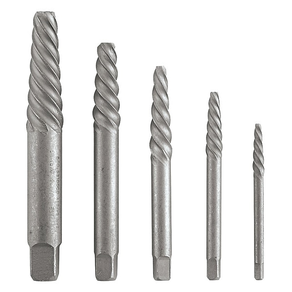 Screw Extractor Set, Extractor Type Spiral Flute Extractor, Number of Pieces 5, Drill Size 1/4 in, 17/64 in, 5/32 in, 5/64 in, 7/64 in, For Bolt Size 1/8 in and 1/4 in Pipe, 3/32 in to 5/8 in, Material - Machining Carbon Steel