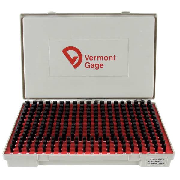 The VERMONT GAGE 901100500 Pin Gage Set, Plus, 0.251-0.500 In is a convenient gauge block set that you can use to measure the size of holes within +.0002/-.0000 in tolerance range. This black oxide-coated pin gage set has a nominal size of 0.251 to 0.500" and is made from tool steel for durability and performance on the job site or in your workshop. The grade is Class ZZ with a class tolerance of +/-0.0002". It comes complete with a cylindrical shape and overall length of 2 in., making it easy to handle and store away when not in use. When you need precise measurements for accurate drilling, threading or reaming operations, the VERMONT GAGE 901100500 Pin Gage Set will come in handy.