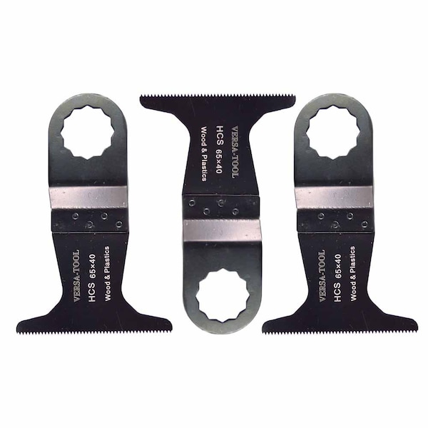 Versa Tool FB3D-D 65mm HCS Multi-Tool Saw 3 Blade Pack Fits Fein Supercut Oscillating Tools.Ideal for flush cuts and cut-outs in hard, non metallic materials such as hardwoods, plywood and particle board this wood blade can also tackle materials such as plastics, fiberglass and Plexiglas. Designed to saw into corners and cut angles with precision the wood blade can be utilized for even the toughest tasks.