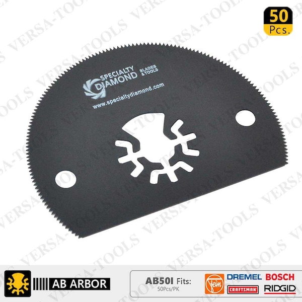 Versa Tool AB50I 80mm HSS Semi-Circular Multi-Tool Saw Blades 50/Pk Fits Fein Multimaster, Dremel, Bosch, Craftsman, Ridgid Oscillating Tools.Made from high speed steel, the 80mm wood and metal cutting blade is ideal for making precise cuts in nail embedded wood, drywall and plaster material. Applications include cutting openings in flooring for venting, repairing damaged flooring and cutting openings for electrical boxes. The blade can also be used for cutting metal materials such as copper, tin, aluminum and nails.