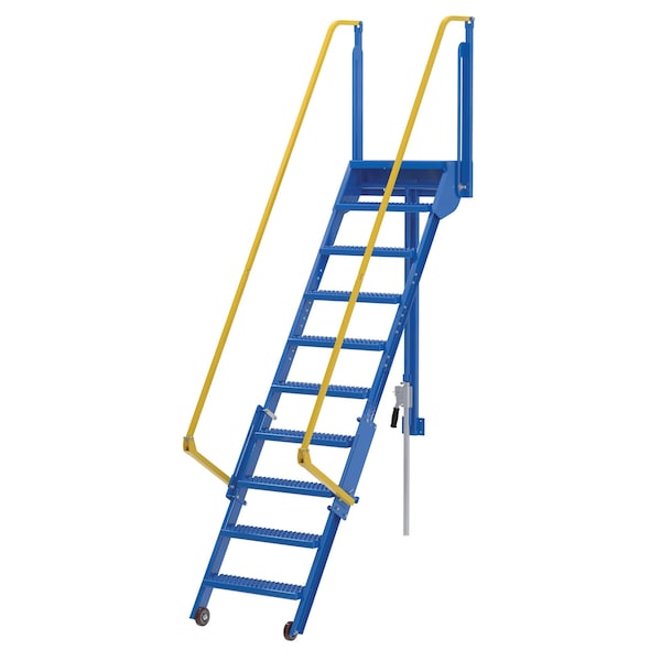 The mezzanine ladders are used for infrequent usage to access mezzanines. They are ratcheted into climbing angle and back into stored position. The wheels roll on the ground when ratcheted and the handrails mechanically rise into climb position when ladder locks into position. Quickly extend and retract the ladder. The mezzanine ladder allows for quick installation with mounting bracket provided for bolt-on installation or welded installation. Customer must provide their mezzanine height at time of purchase. Baked-in powder-coated toughness. Meets or exceeds all OSHA requirements. Ships knockdown, some assembly required.