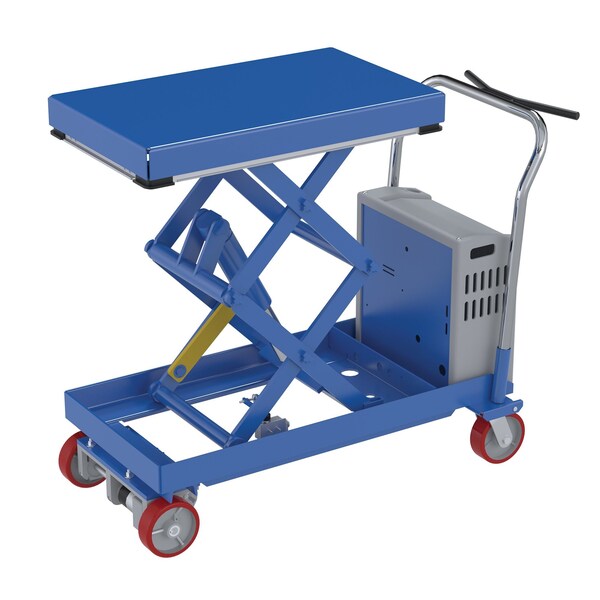 The traction drive electric Hydraulic elevating carts make maneuvering heavy loads virtually effortless. A twist style throttle with reverse facilitates the maneuverability of this cart. The push of a button will raise and lower the platform. Includes two (2) 12V battery system with a 115V AC on-board charger and battery charge indicator. Standard features include: powered front industrial 6" x 2" poly-on-steel drive wheels.