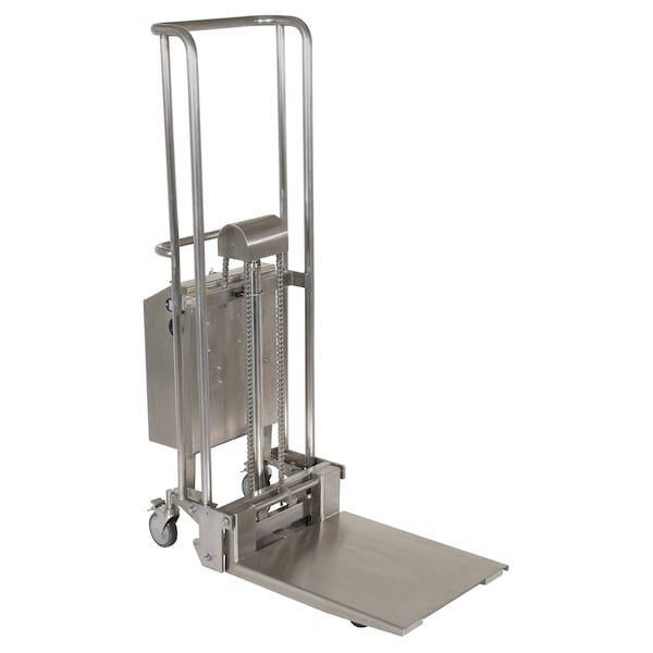 The Hefti-Lift is a user friendly, portable hydraulic lift. The lift provides reliable, power lifting when moving and positioning loads. It includes a removable platform for operation requiring forks. The non-slip chain is used for accurate positioning while the lift rolls easily on two rigid and two swivel poly-on-steel casters that includes a foot operated brake. The unit has an all welded construction with a chrome platform and uprights. Not for use with pallets.