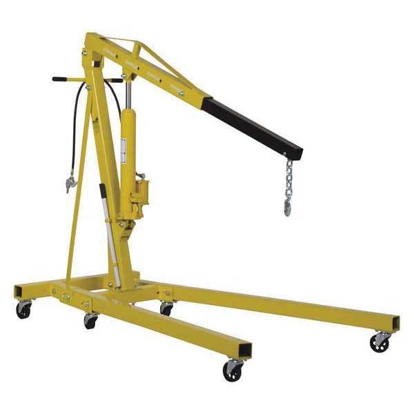 Engine Crane, Frame Material Steel, Load Capacity 2 ton, Number of Boom Positions 4, Boom Capacity (First Position) 2 ton, Boom Capacity (Second Position) 3,000 lb, Boom Capacity (Third Position) 1 ton, Boom Capacity (Fourth Position) 0.5 ton, Color Yellow, Caster Type Swivel, Chain Length 11 in, Crane Type Engine Crane, Features Adjustable Boom, Folding Legs, Swivel Hook, Lift Actuation Pneumatic, Overall Height 58 in, Overall Length 72 in, Overall Width 43 in