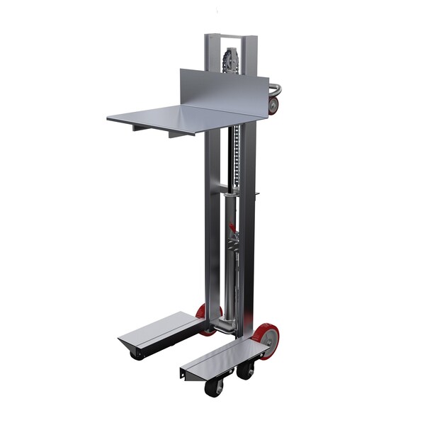 Aluminum construction provides long lasting rugged use. Easy to operate lift system makes lifting products to ergonomic heights simple. Two rear and four swivel front wheel design conveniently rolls when loaded. Two rollers on handle provide easy unit loading into delivery trucks