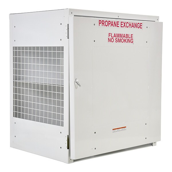 Cylinder Storage Cabinet, Assembled Assembled, Color White, Compatible Tank Size 20 lb, Construction Steel, Cylinder Storage Orientation Vertical, Door Closure Type Self-Closing, Door Construction Steel, Door Type Hinged, Exterior Depth 32 1/8 in, Exterior Height 44 1/8 in, Exterior Width 40 in, Finish Powder Coated, Floor Construction Solid, Includes Red Lettered Signage Noting In.Propane Exchange, Flammable, No Smoking In., Lock Type Padlock, Material Steel, NFPA 30 Not NFPA 30 Compliant