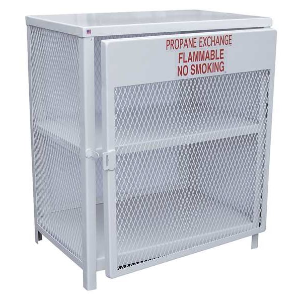 Cylinder Storage Cabinet, Assembled Assembled, Color White, Compatible Tank Size 20 lb, Construction Steel, Cylinder Storage Orientation Vertical, Door Closure Type Self-Closing, Door Construction Wire Mesh, Door Type Hinged, Exterior Depth 32 1/8 in, Exterior Height 44 1/8 in, Exterior Width 40 in, Finish Powder Coated, Floor Construction Solid, Includes Red Lettered Signage Noting In.Propane Exchange, Flammable, No Smoking In., Lock Type Padlock, Material Steel, NFPA 30 Not NFPA 30 Compliant