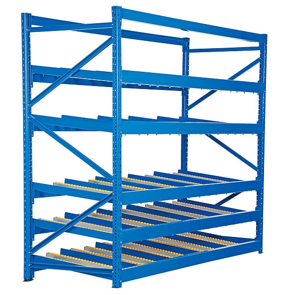 Gravity Flow Rack, 1,000 lb Load Capacity per Shelf, Tilted Shelf Angle, 14 ga Shelf Gauge, Starter Shelving Configuration, 2 in Shelf Adjustment Increments, Number of Shelves 5, Decking Finish Painted, Decking Material Steel, Skate Wheel Rail Decking Style, Depth per Side 36 in, Painted, Steel, Blue, Overall Depth 36 in, Overall Height 84 in, Overall Width 96 in, 14 ga Post Gauge, 5,000 lb Whole Unit Load Capacity, Assembled Unassembled, (5) Flow Rack Levels, (4) Pairs of Rollers Per Level