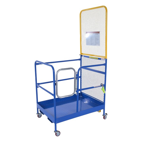 Rolling Work Platform, Load Capacity - Maximum 1,000 lb, Compatible Fork Height 1 7/8 in, Compatible Fork Width 7 3/4 in, Assembly Status Unassembled, Platform Length 45 3/8 in, Platform Width 33 3/8 in, Handrail Height 42 in, Overall Height 93 5/8 in, Number of Guard Rails 4, Door Type Single, Caster Configuration (2) Swivel, (2) Swivel with Brake, Caster Dia. 4 in, Color Blue, Finish Powder Coated, Includes (4) Four Poly Swivel Casters, Manufacturers Warranty Length 1 yr