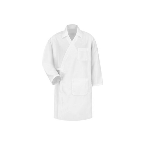 Red kap collarless butcher wrap w/interior pockets, white, polyester/combed cotton, l features: model ws40 butcher wrap white a self-tie closure lets you suit up on the fly. One exterior chest pocket and two exterior lower pockets offer plenty of storage, while side vent openings move with you throughout the day 6 oz. 100% spun polyester reversible tie closure one-piece collar interior left chest and two interior lower pockets side vent openings