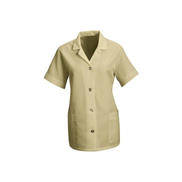 Red kap women's smock loose fit short sleeve tan s - tp23 the choice is yours in this customizable smock. Five bright colors stay true through industrial laundering and two unique styles keep you comfortable on the job. Loose with short sleeves. One-piece, lined, notched lapel. Performance blend poplin. Pre-cure durable press. Two lower french-hemmed pockets.
