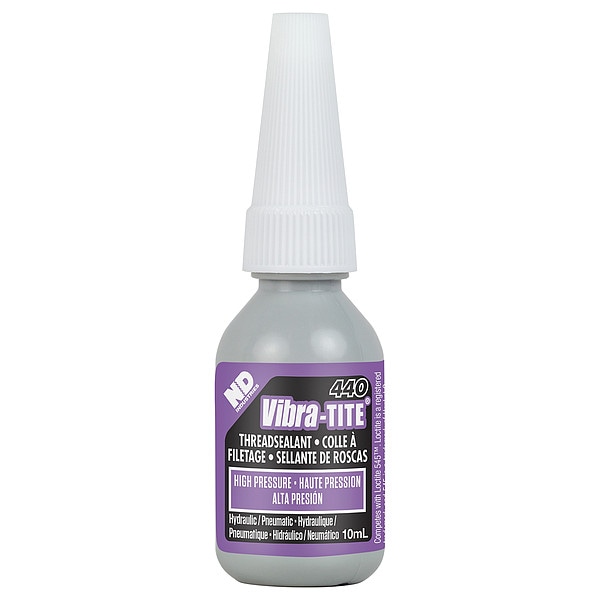 Pipe Thread Sealant, Cure Type Anaerobic, Series 440, Container Size 0.3 fl oz, Container Type Bottle, Maximum Operating Temperature 300 Degrees F, Minimum Operating Temperature -60 Degrees F, Maximum Operating Pressure for Gases 300 psi, Maximum Operating Pressure for Liquids 10,000 psi, Color Purple, For Fluid Type Grease, Oil, For Material Type Metal, Specific Sealing Application For Hydraulic Systems, For Maximum Thread Diameter 2 in, Chemical Base Dimethacrylate