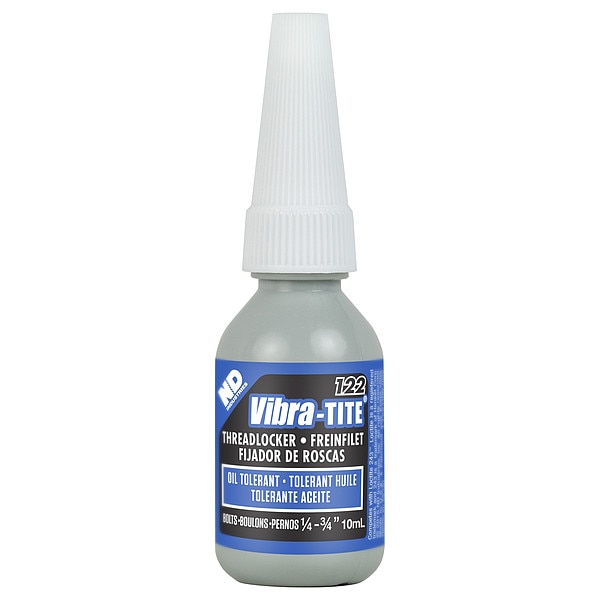 Primerless Medium-Strength Threadlocker, For Material Type Brass, Bronze, Copper, Iron, Manganese, Monel, Nickel, Steel, Threadlocking Strength Medium, Color Blue, Series 122, Container Size 0.34 fl oz, Container Type Bottle, For Maximum Thread Diameter 3/4 in, Working Time 4 min, Breakaway Torque 195 in-lb, Cure Type Anaerobic, Compatible Primer Series Vibra-Tite 611, Threadlocker Properties Oil Tolerant, Chemical Base Modified Acrylate, Compatible Primer (Grainger Part Number) 49CH64
