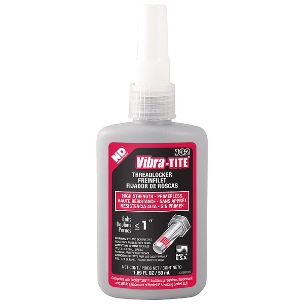 Primerless High-Strength Threadlocker, For Material Type Stainless Steel, Threadlocking Strength High, Color Red, Series 132, Container Size 1.69 fl oz, Container Type Bottle, For Maximum Thread Diameter 1 in, Working Time 5 min, Breakaway Torque 275 in-lb, Cure Type Anaerobic, Primer Required No, Compatible Primer Series Vibra-Tite 611, Vibra-Tite 612, Reuse Count 0, Threadlocker Properties Oil Tolerant, Standards HCS, OSHA, Chemical Base Ethyl, Flash Point 100 Degrees C, Full Cure Time 1 day