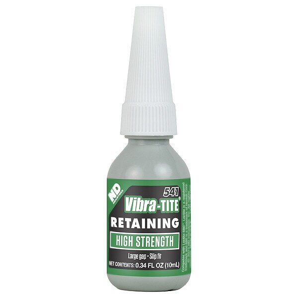 Retaining Compound, For Material Type Steel, Retaining Compounds Properties For Loose Fitting Parts, Series 541, Container Size 0.3 fl oz, Container Type Bottle, Maximum Gap Fill Size 0.015 in, Working Time 5 min, Maximum Operating Temperature 350 Degrees F, Minimum Operating Temperature -60 Degrees F, Color Green, Full Cure Time 1 day, Shear Strength 3,500 psi, Standards NSF Non-Food, Primer Required Yes, Clean Up Method Neutralizing Agent, Compatible Primer Series Excel 612