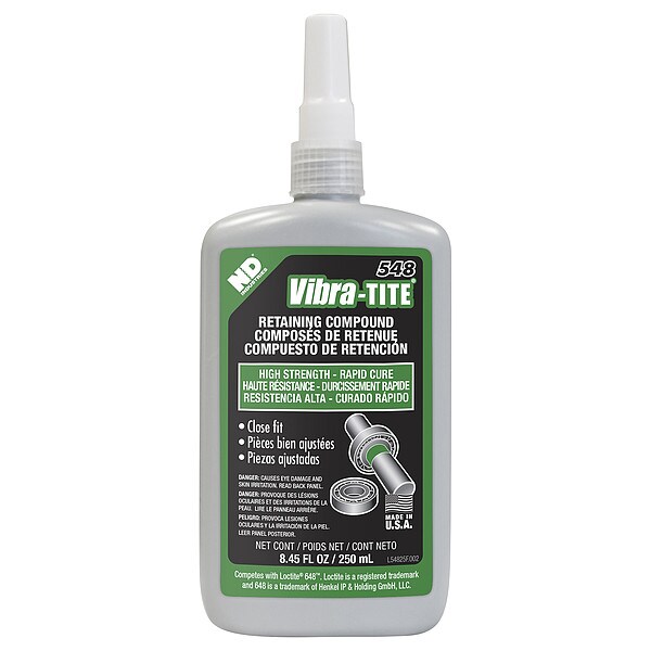 Retaining Compound, For Material Type Aluminum, Stainless Steel, Steel, Retaining Compounds Properties High Temperature Resistant, Series 548, Container Size 8.5 fl oz, Container Type Bottle, Maximum Gap Fill Size 0.007 in, Working Time 2 min, Maximum Operating Temperature 350 Degrees F, Minimum Operating Temperature -65 Degrees F, Color Green, Full Cure Time 1 day, Shear Strength 3,260 psi, Cure Type Anaerobic, Flash Point 203 Degrees F, Maximum Viscosity 600 cps, Minimum Viscosity 450 cps