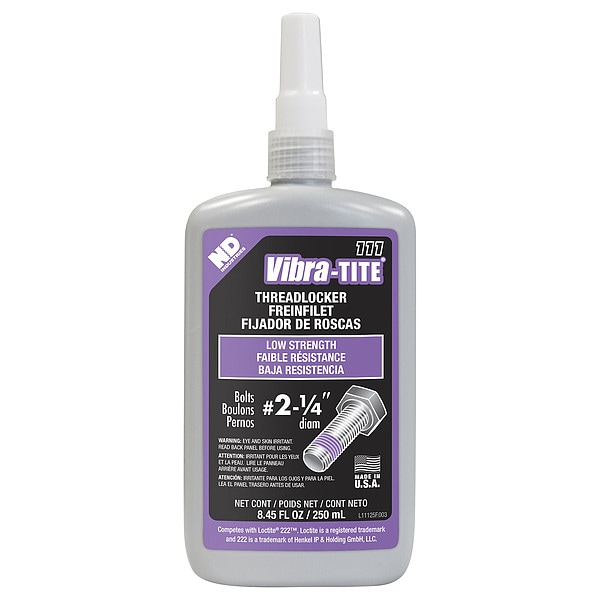Low-Strength Threadlocker, For Material Type Brass, Bronze, Copper, Iron, Manganese, Monel, Nickel, Steel, Threadlocking Strength Low, Color Purple, Series 111, Container Size 8.45 fl oz, Container Type Bottle, For Maximum Thread Diameter 1/4 in, Working Time 4 min, Breakaway Torque 75 in-lb, Cure Type Anaerobic, Compatible Primer Series Vibra-Tite 611, Standards ASTM D-5363, MIL-S-46163-A, NSF Non-Food, Compatible Primer (Grainger Part Number) 49CH64, Flash Point 268 Degrees F