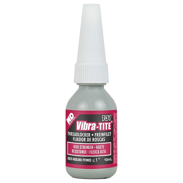 High-Strength Threadlocker, For Material Type Brass, Bronze, Copper, Iron, Manganese, Monel, Nickel, Steel, Threadlocking Strength High, Color Red, Series 131, Container Size 0.34 fl oz, Container Type Bottle, For Maximum Thread Diameter 1 in, Working Time 4 min, Breakaway Torque 200 in-lb, Cure Type Anaerobic, Compatible Primer Series Vibra-Tite 611, Threadlocker Properties High-Temperature Resistant, Standards ASTM D-5363, MIL-S-46163-A, NSF Non-Food