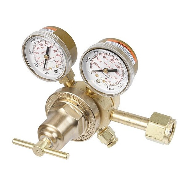 Victor VTS 250 Series Two Stage Medium Duty Oxygen Regulator offers 5 - 125 psig delivery range and is ideal for applications that need a constant delivery pressure over a range of decreasing inlet pressures. Regulator with maximum inlet pressure of 3000 psig features die-forged brass body and spring housing cap for strength as well as durability. Regulator featuring 2 steel gauges has 4000 inlet gauge range and 200 outlet gauge range. Regulator has accurate two-stage regulation that offers high operating characteristics for applications where change in delivery pressure would impact performance characteristics of work or test results. Regulator with 540 CGA inlet connection and 9/16-8 RHM outlet connection has 1.3, 1 3/4 fabric reinforced neoprene diaphragm that provides precise long lasting service. Two stage regulator is specifically suited for various medium to high capacity general-purpose applications that need accurate and uniform outlet pressures. Regulator with 0.082 Cv flow coefficient has electro less nickel plated bronze sintered inlet filter. Regulator comes with long-lasting Delrin insert bushing and stainless ball in key for easy adjustment. Regulator with adjusting spring is pretested for quality assurance and has precision-machined nozzle for maximum flow control. Regulator includes stem-type seat mechanism inlet pressure that helps in sealing and external self-reseating relief valve. Regulator measuring 6 1/2 X 6.13 X 5.63 delivers at least the stated upper range and in some cases may surpass the stated upper range.