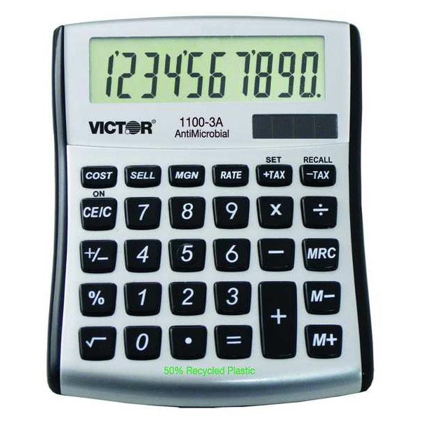 Desktop Calculator, Desktop, Length 5 in, Width 4 1/2 in, Depth 1 1/8 in, Display Digits 10, Display LCD, Display Dimensions 1 in H x 3 in W, Print Speed Not Applicable, Ink Type Not Applicable, Automatic Constants, Change Sign, Cost/Sell/Margin, Percentage, Square Root, Business Calculations, Antimicrobial, Power Supply Battery, Solar