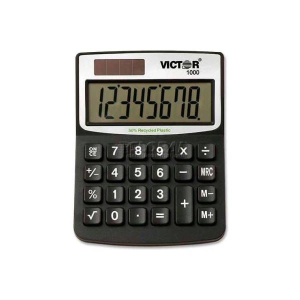 Victor 8-digit mini-desktop calculator, 1000, dual power, 3-1/4" x 4-1/4" x 1/2", black -digit mini desktop calculator is made with a high percentage of recycled plastic. Extra-large angled lcd has full 18mm display digits. Functions include addition, subtraction, multiplication, constant multiplication, division, percentage, percentage add-on, discount calculations and three-key independent memory. Calculator has soft plastic keys and runs on solar power with battery backup. larger quantity quotes available. Please call 1-888-978-7759. this product arrives to most customers in 2-3 business days.