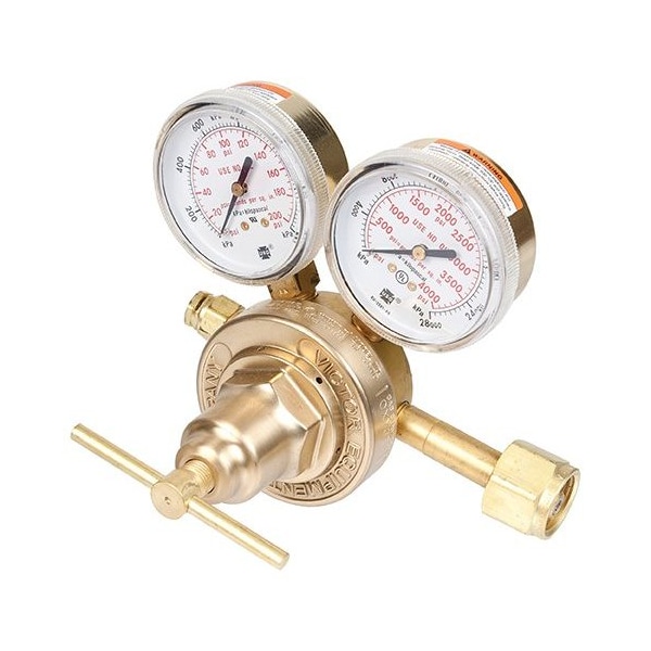 Victor SR 350 Single Stage Heavy/Medium Duty Oxygen Regulator offers 5 - 125 psig delivery range and is ideal for applications where little delivery pressure increases due to decreasing cylinder pressures that would not affect the performance characteristics of the work or test results. Regulator with maximum inlet pressure of 3000 psig features die-forged brass body for strength as well as durability. Regulator featuring 2 1/2" brass gauges has 4000 inlet gauge range and 200 outlet gauge range. Regulator with 540 CGA inlet connection and 9/16"-18 RH(M) outlet connection has 2 3/4" fabric reinforced neoprene diaphragm that provides precise long lasting service. Single stage regulator is specifically designed for medium to high capacity. Regulator with 0.238 Cv flow coefficient has electro less nickel plated bronze sintered inlet filter. Regulator has adjusting screw for convenience. Regulator comes with long-lasting Delrin insert bushing and stainless ball in key for easy adjustment. Regulator with adjusting spring is pretested for quality assurance and has precision-machined nozzle for maximum flow control. It includes stem-type seat mechanism inlet pressure that helps in sealing and external self-reseating relief valve. Regulator measuring 7 1/2" X 4 1/2" X 6 1/2" delivers at least the stated upper range and in some cases may surpass the stated upper range.