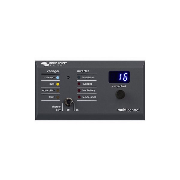 Digital Multi Control 200/200A GX (Right Angle RJ45) Retail - The Digital Multi Control is used to remotely view and adjust AC input currents, and turn on and off the Multi or Quattro. It is designed to integrate cleanly with your boat, vehicle or house system control panel. The Digital Multi Control panel (DMC) is designed to work with all Multi/Quattro. This includes stand alone, parallel and 2-3 phase configurations. Connecting the DMC to your system is simple, in most cases just connecting the DMC with an RJ45 cable is sufficient and no extra set-up handling is required.