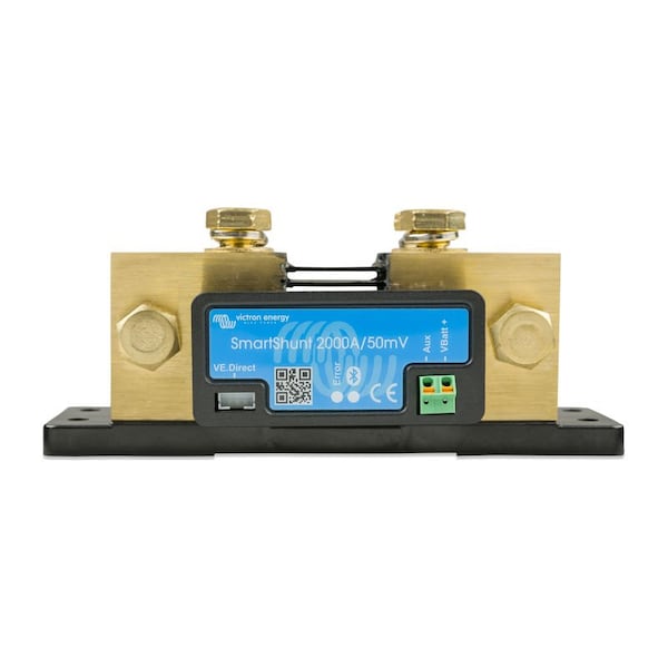 SmartShunt 2000A/50mV - The SmartShunt is an all in one battery monitor, only without a display. Your phone acts as the display. The SmartShunt connects via Bluetooth to the VictronConnect App on your phone (or tablet) and you can conveniently read out all monitored battery parameters, like state of charge, time to go, historical information and much more. Alternatively the SmartShunt can be connected and be read by a GX device. Connection to the SmartShunt is made via a VE.Direct cable. The SmartShunt is a good alternative for a BMV battery monitor, especially for systems where battery monitoring is needed but less wiring and clutter is wanted. The SmartShunt is equipped with Bluetooth, a VE.Direct port and a connection that can be used for: monitoring a second battery, midpoint monitoring or a temperature sensor.