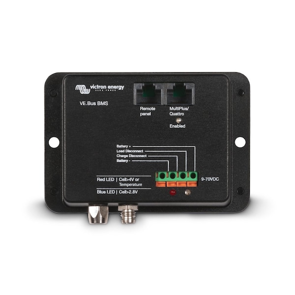 VE.Bus BMS - The VE.Bus BMS protects each individual cell of a Victron lithium-iron-phosphate (LiFePO4 or LFP) battery. Each individual cell of a LiFePO4 battery must be protected against over voltage, under voltage and over temperature. Victron LiFePO4 batteries have integrated Balancing, Temperature and Voltage control (acronym: BTV) and connect to the VE.Bus BMS with two M8 circular connector cord sets.The BTVs of several batteries can be daisy chained. Please see our LiFePO4 battery documentation for details. The BMS will: Shut down or disconnect loads in case of imminent cell under voltage. Reduce charge current in case of imminent cell overvoltage or over temperature (VE.Bus products only, see below). Shut down or disconnect battery chargers in case of imminent cell overvoltage or over temperature.