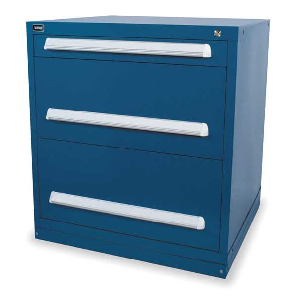 Cabinet Pedestal, Assembly Fully Assembled, Color Blue, Features Adjustable Dividers, Adjustable Partitions, All-Welded, Stand-Alone, Finish Powder Coated, Includes Lock, Lock Type Keyed, Material Steel, Maximum Drawer Load Capacity 400 lb, Number of Compartments 40, Number of Drawers 3, Overall Depth 29 3/4 in, Overall Height 33 in, Overall Width 30 in, Pedestal Type Cabinet, Weight 258 lb