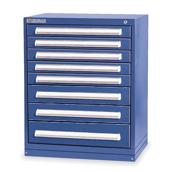 Modular Drawer Cabinet, Base Type Frame, Adjustable Dividers Yes, Cabinet Color Dark Blue, Cabinet Storage Components Drawers, Drawer Height 2 1/4 in, 3 7/8 in, 5 3/8 in, Includes Dividers Yes, Number of Compartments per Drawer (1) 16, (2) 20, (5) 24, Number of Dividers 176, Number of Drawers 8, Overall Depth 27 3/4 in, Overall Height 37 in, Overall Width 30 in, Mobility Stationary, Number of Compartments 176, Cabinet Finish Powder Coated, Cabinet Material Steel, Drawer Access Multiple