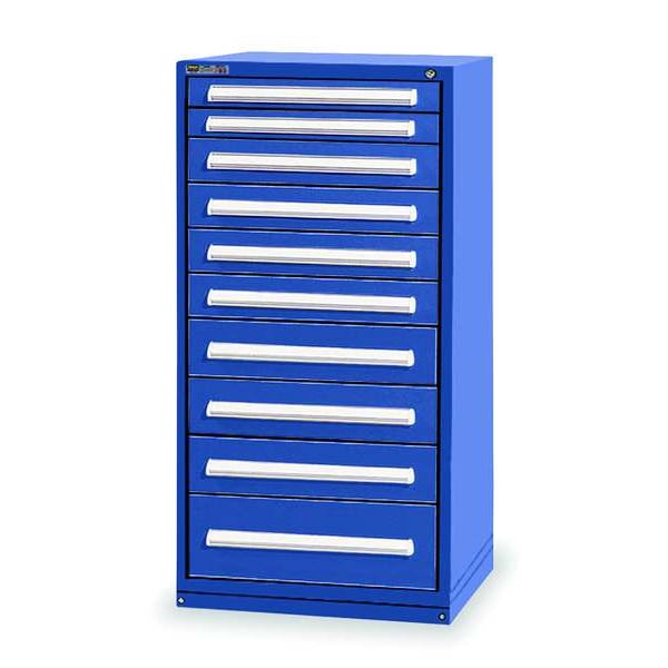 Modular Drawer Cabinet, Base Type Frame, Adjustable Dividers Yes, Cabinet Color Dark Blue, Cabinet Storage Components Drawers, Drawer Height 2 1/4 in, 3 7/8 in, 5 3/8 in, 8 1/2 in, Includes Dividers Yes, Number of Compartments per Drawer (1) 12, (2) 24, (3) 16, (4) 20, Number of Dividers 188, Number of Drawers 10, Overall Depth 27 3/4 in, Overall Height 59 in, Overall Width 30 in, Method of Construction Welded, Mobility Stationary, Number of Compartments 188, Cabinet Finish Powder Coated