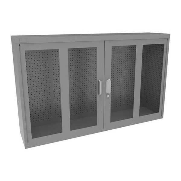 Pegboard Wall Cabinet, Frame Assembled Assembled, Cabinet Color Gray, Cabinet Storage Components Pegboard, Door Handle Type Pull, Door Type Clearview, Overall Depth 14 in, Overall Height 37 in, Overall Width 60 in, Pegboard Height 37 in, Pegboard Width 60 in, Peg Hole Shape Round, Mounting Location Wall, Cabinet Material Steel, Includes Mounting Hardware No, Lock Type Keyed, Panel Material Thickness 20 ga, Door Locking Points 2, Duty Rating Medium Duty, Method of Construction Welded