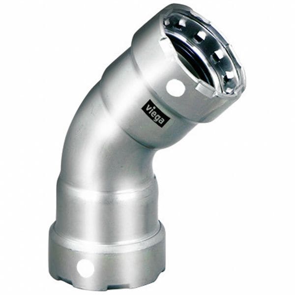 Crimp Elbow Fitting, Application Chemical, Fitting Side A Connection Type Press-Fit, Fitting Side B Connection Type Press-Fit, Fitting Side A Copper Tube Size Not Applicable, Fitting Side B Copper Tube Size Not Applicable, Fitting Material Stainless Steel, Fitting Side A Pipe Size 1 1/4 in, Fitting Side B Pipe Size 1 1/4 in, Material Grade 304, O-Ring Material FKM, Specific Fitting Shape 45 Degrees Elbow, Fitting Side A Tube Outer Diameter 1 1/4 in, Fitting Side B Tube Outer Diameter 1 1/4 in