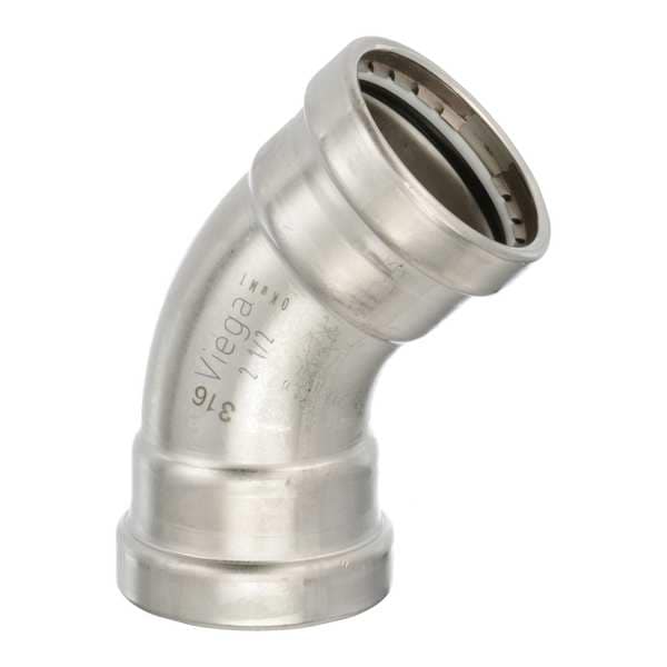 Crimp Elbow Fitting, Application Potable Water, Fitting Side A Connection Type Press-Fit, Fitting Side B Connection Type Press-Fit, Fitting Side A Copper Tube Size 2 1/2 in, Fitting Side B Copper Tube Size 2 1/2 in, Fitting Material Stainless Steel, Material Grade 316, O-Ring Material EPDM, Specific Fitting Shape 45 Degrees Elbow, Number of Bolt Holes Not Applicable, Flange Thickness Not Applicable, Compatible Tube Hardness Not Applicable, Compatible Tube Material Not Applicable