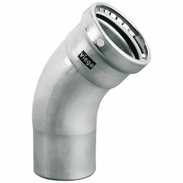 Crimp Elbow Fitting, Application Chemical, Fitting Side A Connection Type Press-Fit, Fitting Side B Connection Type FTG, Fitting Side A Copper Tube Size Not Applicable, Fitting Side B Copper Tube Size Not Applicable, Fitting Material Stainless Steel, Fitting Side A Pipe Size 3 in, Fitting Side B Pipe Size 3 in, Material Grade 304, O-Ring Material FKM, Specific Fitting Shape 45 Degrees Street Elbow, Fitting Side A Tube Outer Diameter 3 in, Overall Length 4 9/16 in