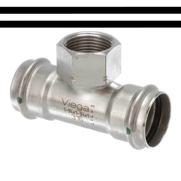 Crimp Tee Fitting, Application Potable Water, Fitting Side A Connection Type Press-Fit, Fitting Side B Connection Type Press-Fit, Fitting Side C Connection Type FPT, Fitting Side A Copper Tube Size 1 1/4 in, Fitting Side B Copper Tube Size 1 1/4 in, Fitting Material Stainless Steel, Fitting Side C Pipe Size 1 in, Material Grade 316, O-Ring Material Rubber, Specific Fitting Shape Adapter Tee, Fitting Side A Tube Outer Diameter 1 1/4 in, Fitting Side B Tube Outer Diameter 1 1/4 in