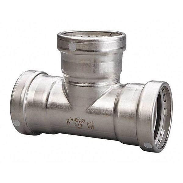 Crimp Tee Fitting, Application Non-Potable Water, Fitting Side A Connection Type Press-Fit, Fitting Side B Connection Type Press-Fit, Fitting Side C Connection Type Press-Fit, Fitting Side A Copper Tube Size 4 in, Fitting Side B Copper Tube Size 4 in, Fitting Side C Copper Tube Size 1 1/2 in, Fitting Material Stainless Steel, Material Grade 304, O-Ring Material FKM, Specific Fitting Shape Reducing Tee, Overall Length 6 7/8 in, Maximum Operating Pressure 200 psi