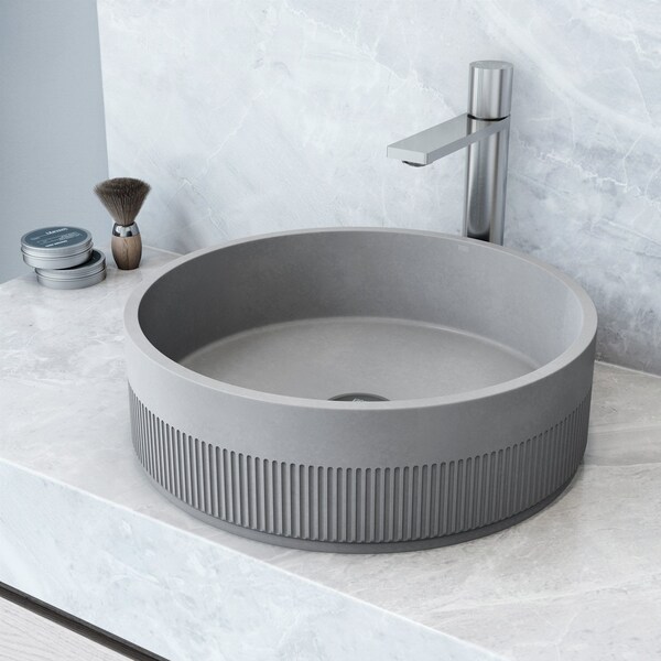VIGO Cypress vessel sink showcases a modern and minimalist design approach. This circular sink, measuring 16-in. L x 16-in. W x 5-in. H, features a sleek gray finish that adds a contemporary touch to any bathroom. Its round shape and neutral color make it versatile enough to complement various decor styles. The sink's exterior is adorned with fine vertical ridges, creating an interesting textural contrast with the smooth interior basin. Crafted from durable ConcretoTM material, this vessel sink resists scratches and stains, ensuring long-lasting beauty and easy maintenance. The non-porous surface inhibits bacterial growth, promoting better hygiene in your bathroom. This VIGO sink sits elegantly atop countertops, making a stylish statement while remaining highly functional. Its design allows for flexible placement options, working well with different faucet types and vanity configurations. The premium look of this vessel sink elevates the overall aesthetic of your bathroom, whether you're aiming for a modern, industrial, or transitional style. With its combination of durability, style, and practicality, this VIGO sink offers a sophisticated solution for homeowners looking to upgrade their bathroom fixtures.