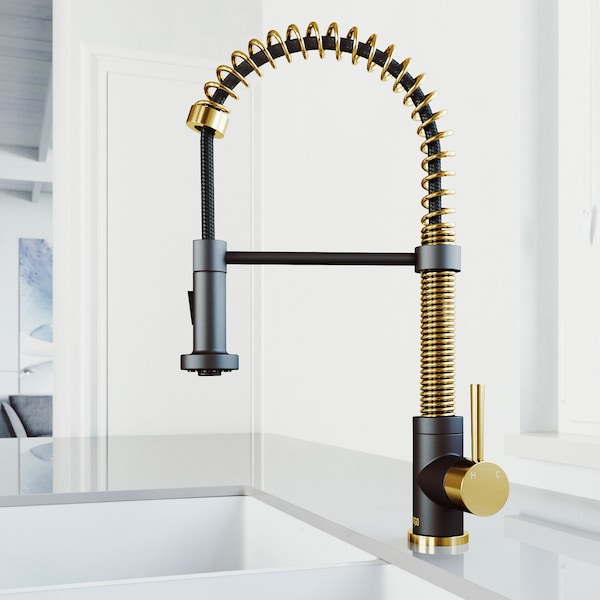 Elevate your kitchen with the VIGO Edison kitchen faucet in gold and black, a perfect blend of modern form and function featuring a high arc spring neck and versatile pull-down sprayer. Combining industrial style with contemporary elegance, this faucet suits various kitchen designs. Key features include smooth operation, dual-mode spray functionality for different cleaning tasks, precise side lever temperature control, water-efficient design to help conserve resources, and durable construction with a fingerprint-resistant gold and black finish. Easily switch from stream mode to powerful sweep spray by pressing the button on the spray head. This professional-grade pull-down sprayer is ideal for both home and commercial kitchens. Its sleek design simplifies food prep tasks like rinsing vegetables or filling pots while ensuring an easy installation process. Additionally, the flexible spout allows you to maneuver effortlessly around your sink area. Upgrade to the VIGO Edison for a stylish yet practical addition to your contemporary kitchen. With its rust-resistant finish and state-of-the-art swivel spout high-arc mechanism, this modern kitchen faucet offers durability and reliable performance over time.