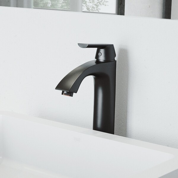 Elevate your bathroom's style with this VIGO Linus 1-hole matte black vessel bathroom sink faucet, designed to make a lasting impression. Standing at 11-in. tall with a sleek 2-in. diameter, this faucet combines form and function seamlessly. The gracefully arched spout, reaching 5-in., offers ample space for comfortable hand-washing and creates a striking visual focal point. Its modern silhouette features clean lines and a minimalist lever handle, perfect for contemporary and transitional bathroom decor. Crafted with premium materials, this faucet promises durability and reliable performance for years to come. The high-arc design not only adds a touch of sophistication but also provides practical benefits, allowing for easy filling of tall containers. Whether you're updating your existing bathroom or designing a new one, this vessel sink faucet will enhance the overall aesthetic while providing effortless functionality. Available in versatile finishes including Brushed Nickel, Chrome, and Matte Black, this faucet can complement any color scheme or design preference, ensuring a cohesive and stylish bathroom space.