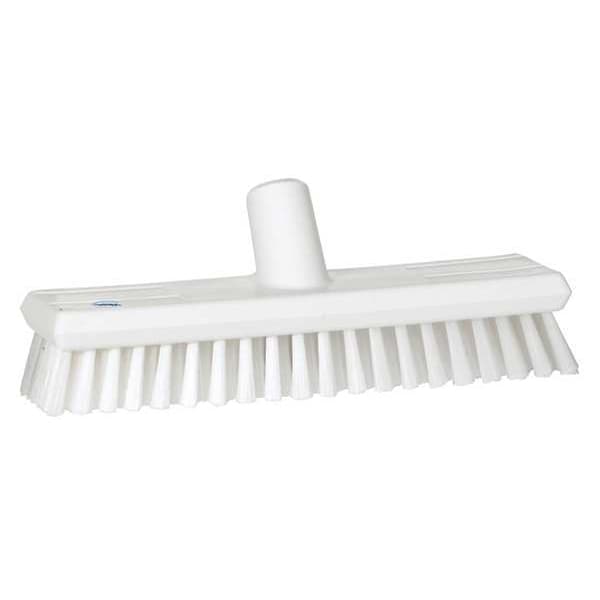 Deck Scrub Head, Tool Type Broom Head, Handle Connection Type Threaded, For Surface Texture Semi-Smooth, Sweep Face 11 in, Bristle Length 2 in, Bristle Material Polyester, Bristle Color White, Block Material Polypropylene, Bristle Firmness Medium, Connection Thread Type European, Chemical Resistant Yes, Features Waterfed, Block Depth 3 in, Block Width 10 3/4 in, FDA Compliant Yes, Acid Resistant Yes, Color Coding System Yes, Block Color White