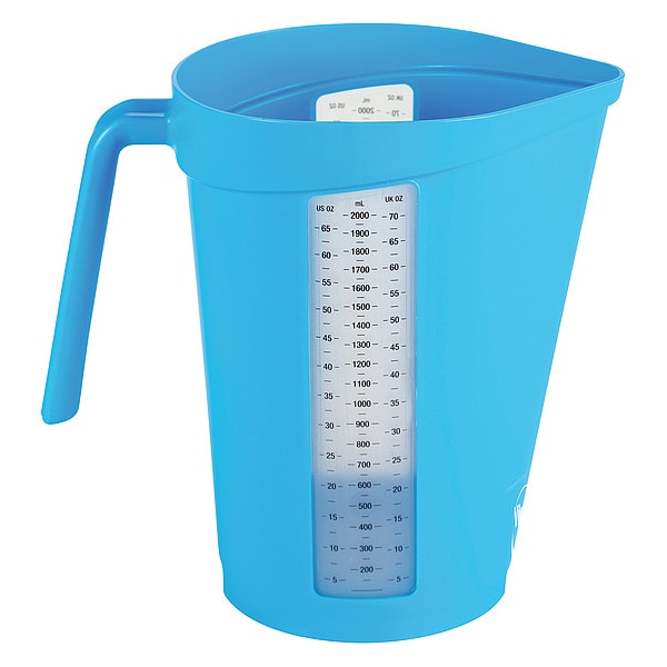 Measuring Cup, Diameter 5 1/2 in, Overall Height 8 1/2 in, Material Polypropylene, Color Blue, Handle Color Blue, Handle Length 4 1/2 in, Handle Style Flat, Number of Pieces 1, Maximum Temperature Resistance 212 Degrees F, Maximum Graduation 2000 mL, Minimum Graduation 200 mL, Capacity 67.6 fl oz, Dry/Liquid Dry, Liquid, Product Type Measuring Jug, Graduation Subdivisions 100 ml, 5 oz, Overall Length 5 1/2 in, Overall Width 8 7/8 in, NSF Certified No